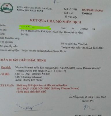 + Hóa mô miễn dịch: CD117, Dog1, Desmin: Âm tính; CD34: Dương tính mạnh; Actin: Dương tính rải rác. Kết luận phối hợp Mô bệnh học và hóa mô miễn dịch phù hợp với u sợi đơn độc (Solitary Fibrous Tumor).