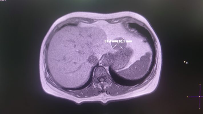 + MRI ổ bụng: Khối tổn thương có tín hiệu đồng nhất trên các chuỗi xung, liên tục với thành dạ dày bờ cong nhỏ, có xâm lấn lớp cơ, đẩy lớp thanh mạc, lồi hẳn ra ngoài dạ dày, kích thước 25 x 25 x 35 mm, bờ đều, giới hạn rõ. Kết luận theo dõi U mô đệm dạ dày.