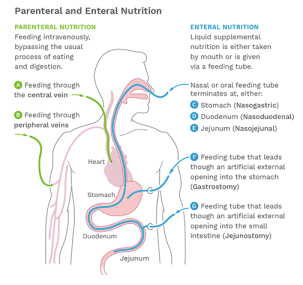 Dinh dưỡng đường ruột (EN – enteral nutrition) bằng công thức hoặc chất lỏng thường được ưu tiên hơn dinh dưỡng tĩnh mạch (PN) trừ khi có chống chỉ định tuyệt đối.