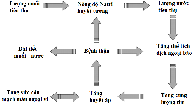 Cơ chế chính của ăn thừa muối gây tăng huyết áp là do khi ăn thừa muối nồng độ ion Natri tăng lên, khiến cơ thể phải cần thêm nước để duy trì ổn định nồng độ dịch thể. Để đáp ứng yêu cầu này, cảm giác khát nước sẽ xuất hiện, làm cho người ăn mặn phải uống nhiều nước. Kết quả là làm tăng dung lượng máu, tim bơm máu mạnh hơn, tạo ra nhiều áp lực lên mạch máu. Hiện tượng này kéo dài có thể dẫn đến tăng huyết áp. Ngày càng có nhiều bằng chứng cho thấy lượng muối tiêu thụ cao có thể trực tiếp làm tăng nguy cơ đột quỵ, phì đại thất trái và bệnh thận; có liên quan đến béo phì do tiêu thụ nước ngọt; có liên quan đến sỏi thận và loãng xương; có liên quan đến mức độ nghiêm trọng của bệnh hen suyễn; và có thể là nguyên nhân chính gây ung thư dạ dày.