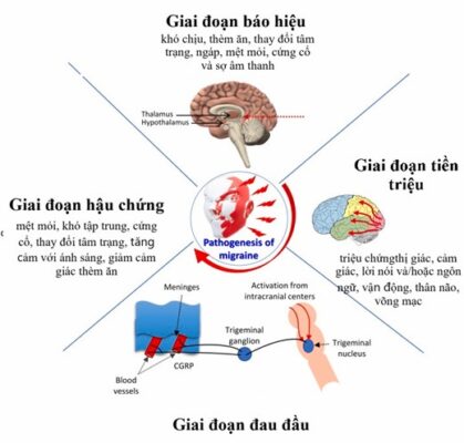 • Ngoài ra, một số dấu hiệu có thể gặp trước, trong và sau cơn đau như: thay đổi tâm trạng, khó chịu, táo bón, cứng cổ, ngáp, thèm ăn hoặc các rối loạn về cảm giác, vận động, thị giác, ngôn ngữ…