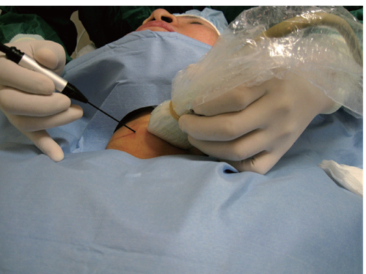 – Bước 1: kiểm tra, xác định vị trí tổn thương bằng lâm sàng và siêu âm tuyến giáp. Đánh dấu vị trí đường vào tổn thương trên da.