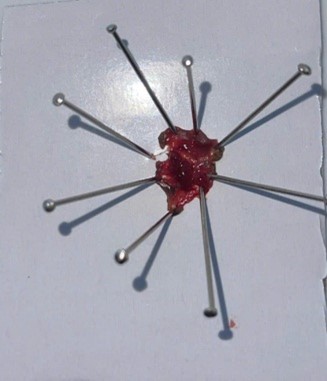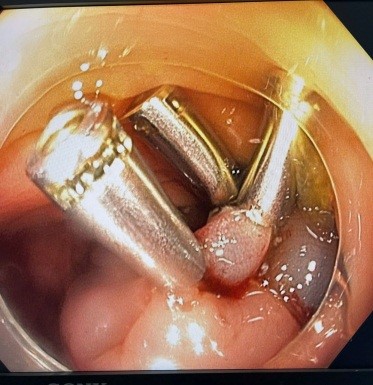 Thực hiện thủ thuật: Can thiệp ngày 12/08/2025, tiến hành soi đại tràng, đánh giá toàn bộ tổn thương. Tiến hành tiêm phồng dưới niêm mạc tổn thương bằng dung dịch cao phân tử. Dùng dao Dual- Knife mở niêm mạc, cắt vòng xung quanh, cắt xung quanh tổn thương, phẫu tích dưới niêm mạc, bóc tách tổn thương bằng dao IT- Knife. Lấy toàn bộ tồn thương làm GPB, cầm máu diện cắt bằng kìm kẹp cầm máu coagrapsper. Can thiệp kéo dài 35 phút. Sau can thiệp bệnh nhân ổn định, cho ăn sau  12h.