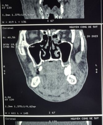 Bệnh nhân nam, 50 tuổi, tiền sử khỏe mạnh, vào viện ngày 17/12/2023 vì lí do sốt, sưng đau vùng má, dưới hàm trái. Trước đó, bệnh nhân xuất hiện tình trạng sưng đau vùng má trái, sốt, khám và điều trị tại y tế cơ sở 2 ngày không đỡ, vào khoa Răng Hàm măt, Bệnh viện Quân y 17 điều trị được chẩn đoán viêm tấy lan tỏa má trái, dưới hàm trái do viêm tuyến nước bọt mang tai trái+ tuyến dưới hàm trái.