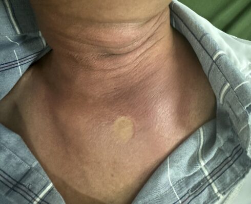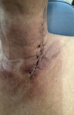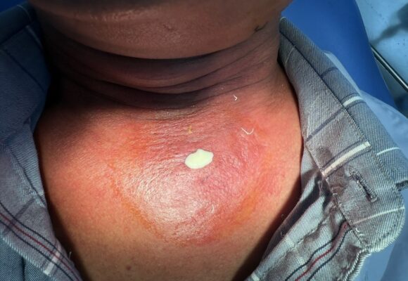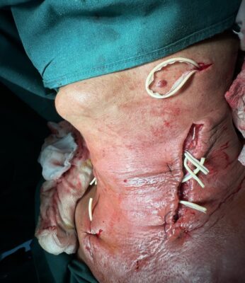 Những ngày tiếp theo sau khi dùng kháng sinh liều cao, phối hợp kháng sinh, vùng viêm lan dần xuống vùng cổ trước và hõm ức, nguy cơ chèn ép đường thở và dịch mủ lan xuống trung thất gây nguy hiểm đến tính mạng bệnh nhân. Sau khi có kết quả chụp MRI, siêu âm vùng cổ và các xét nghiệm cho phép rạch tháo mủ, Khoa Răng Hàm mặt đã tiến hành hội chẩn Bệnh viện và tham khảo ý kiến chuyên gia của Bệnh viện Đà Nẵng thống nhất chẩn đoán viêm tấy lan tỏa vùng dưới hàm, cổ trước giai đoạn hóa dịch hoàn toàn do viêm tuyến nước bọt mang tai, dưới hàm trái phải phẫu thuật cấp cứu dẫn lưu dịch mủ ra ngoài tránh các biến chứng nguy hiểm. Các bác sĩ của Khoa phối hợp với khoa Ngoại chung, khoa Phẫu thuật gây mê hồi sức đã phẫu thuật cấp cứu thành công. Bệnh nhân được phẫu thuật rạch rạch rộng vùng cổ 2 bên, tháo mủ, dẫn lưu ra khoảng 80ml dịch mủ trắng, thay băng bơm rửa 2 lần/ngày, lấy dịch mũ cấy khuẩn và làm kháng sinh đồ. Sau khi có kết quả cấy khuẩn, bênh nhân được dùng thuốc theo kháng sinh đồ, tình trạng viêm lan tỏa được khống chế, lượng dịch mủ giảm, toàn trạng bệnh nhân tốt lên, số lượng bạch cầu giảm dần.