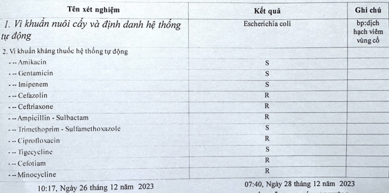+ Lấy dịch mủ vùng cổ nuôi cấy cho kết quả Escherichia Coli