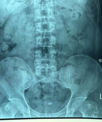 Hình 2: KUB, hình ảnh sỏi cản quang ở tiểu khung, lệch trái