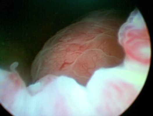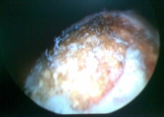 Hình 4: Hình ảnh soi bàng quang, từ cổ bàng quang nhìn vào thấy bên trái có khối lồi niêm mạc phù nề