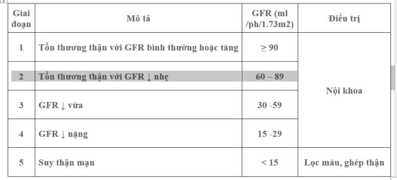 Hội Thận học quốc tế (ISN = International Society of Nephrology) và Hội Thận học quốc gia Hoa Kỳ (National Kidney Foundation) đã chia bệnh thành 5 giai đoạn dựa trên độ lọc cầu thận (GFR) gồm: